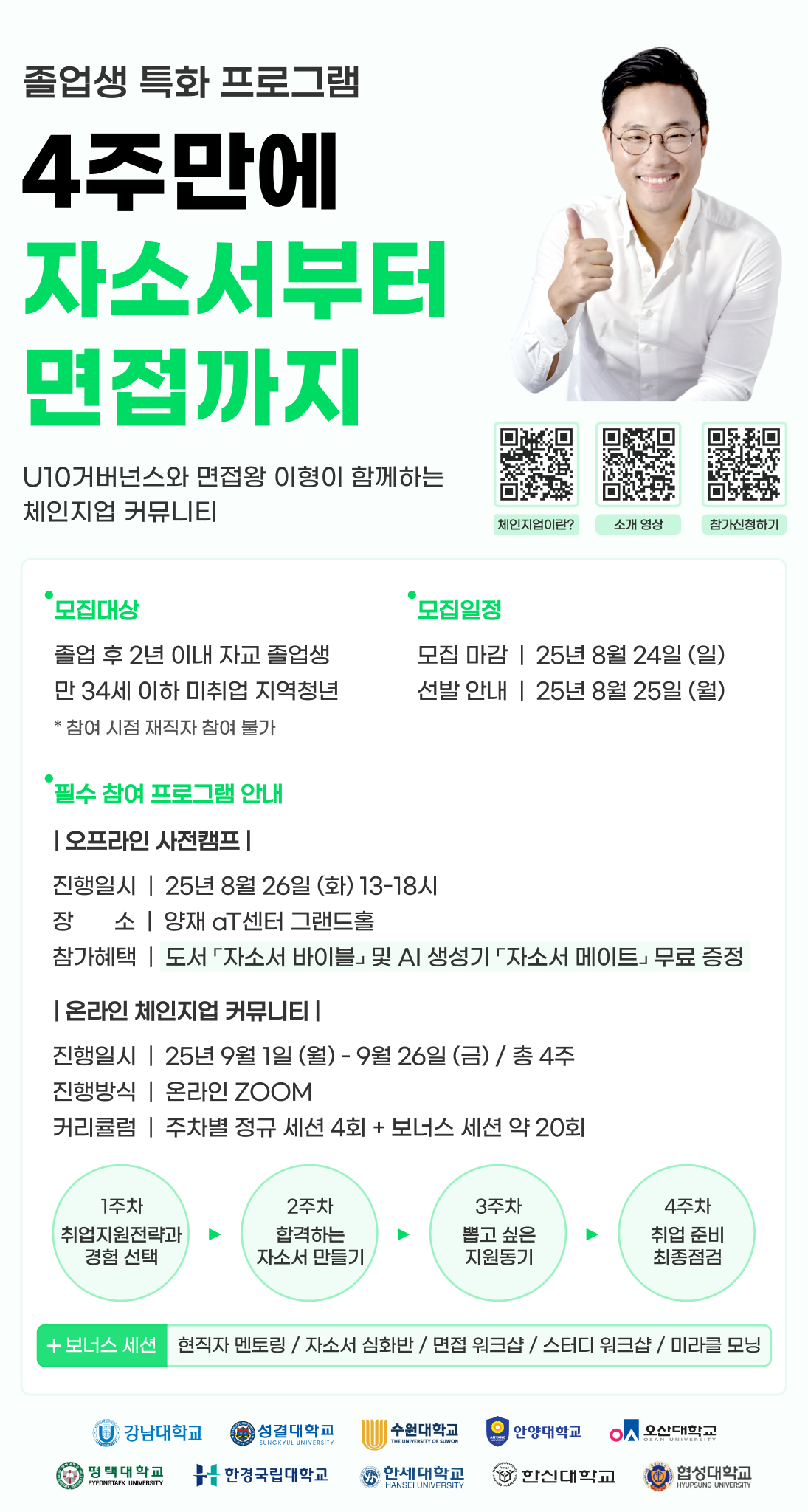 ❍ 운영내용: 유튜버“면접왕 이형”과 함께하는 4주간의 자소서부터 면접까지 체인지업 커뮤니티 프로그램