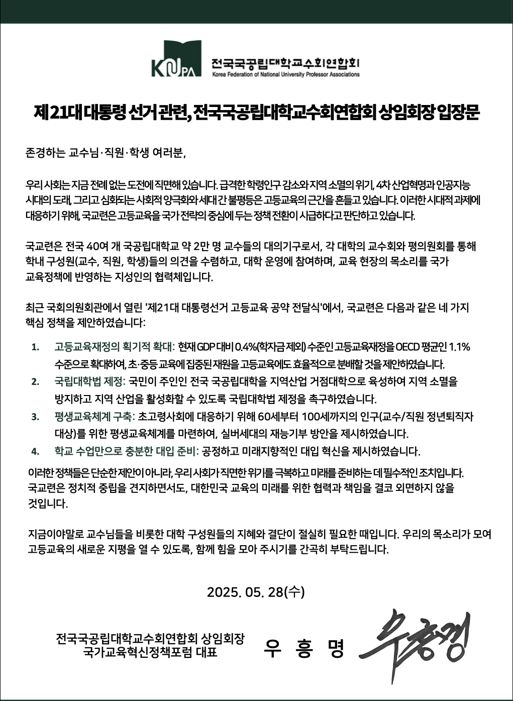 국교련 대선공약 정당별 전달 결과보고