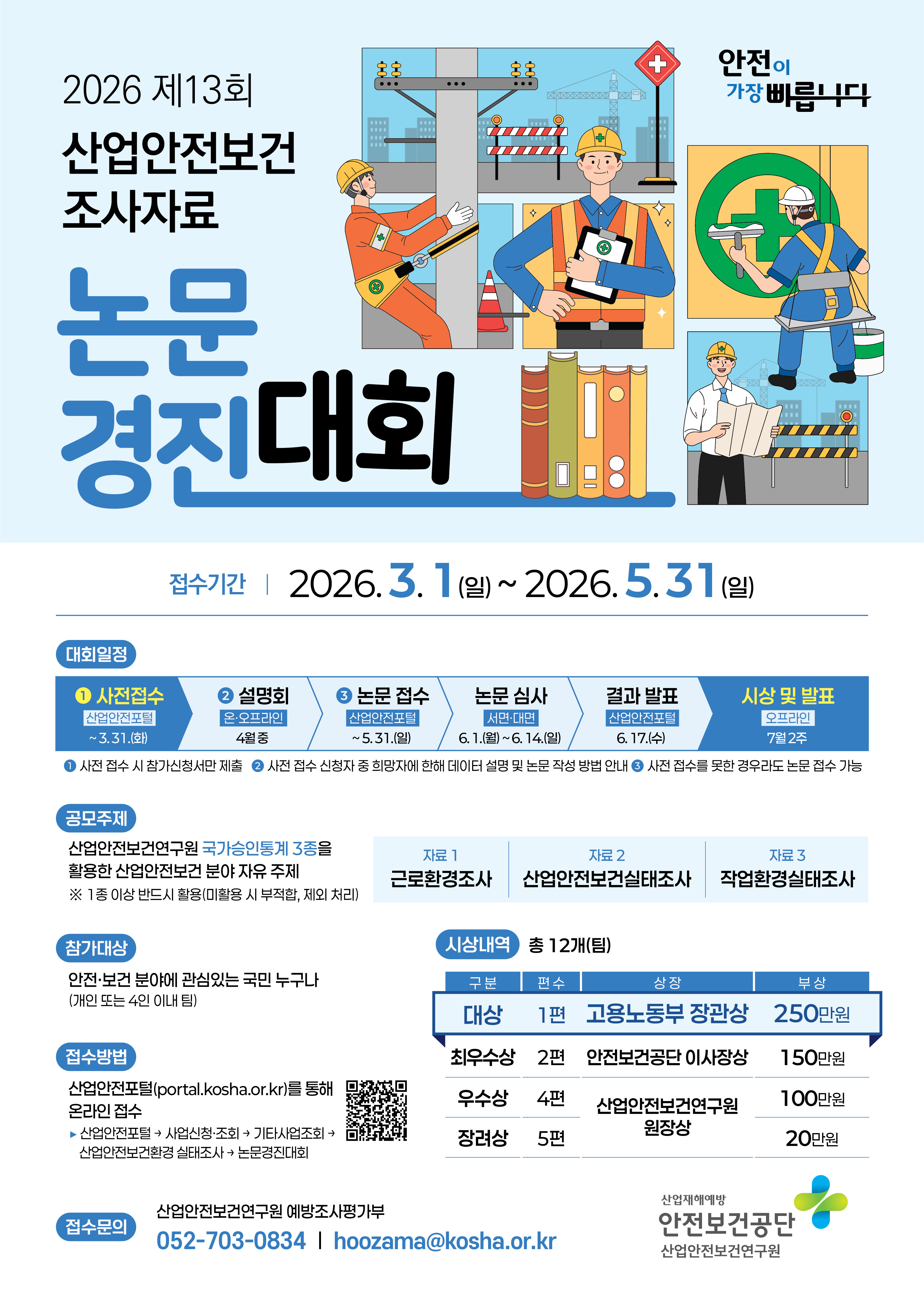 fnctId=bbs,fnctNo=72 페이지 공유 글번호 93635 [산업안전보건연구원] 제13회 산업안전보건 조사자료 논문 경진대회 안내 작성일 2026.03.09 수정일 2026.03.09 작성자 통합행정실 조회수 215 첨부파일 [붙임1]『제13회 산업안전보건 조사자료 논문 경진대회』 포스터.jpg [붙임2]『제13회 산업안전보건 조사자료 논문 경진대회』안내문 및 제출양식.hwp [붙임3]『제12회 산업안전보건 조사자료 논문 경진대회』대상 논문.hwp.pdf