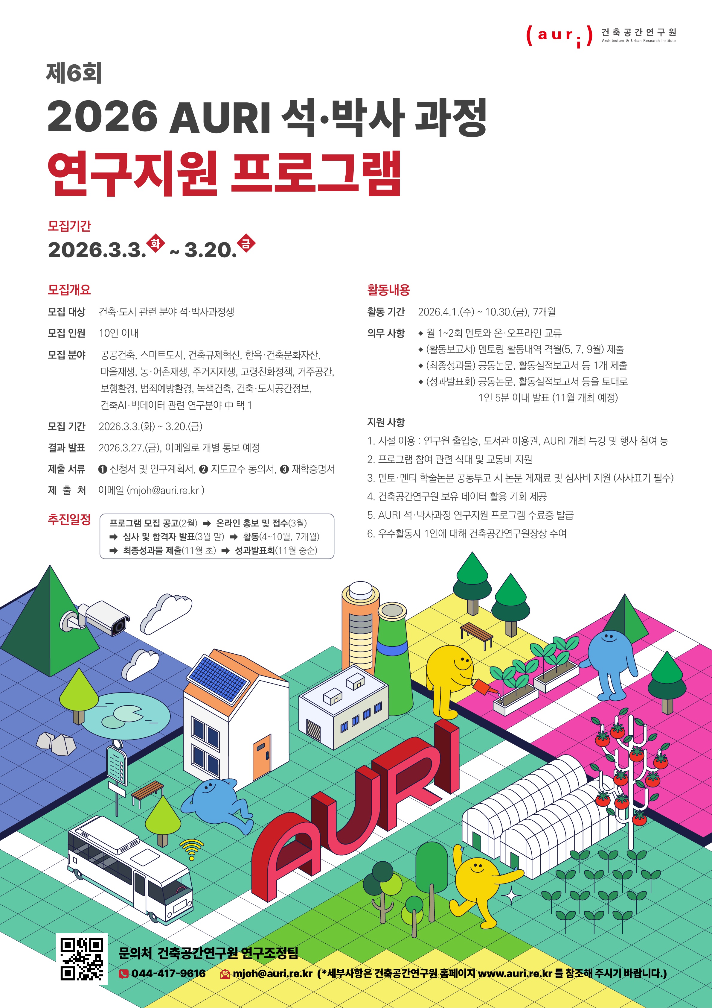fnctId=bbs,fnctNo=72 페이지 공유 글번호 93636 [건축공간연구원] 2025 AURI 석·박사과정 연구지원 프로그램 안내 작성일 2026.03.09 수정일 2026.03.09 작성자 통합행정실 조회수 214 첨부파일 붙임1. 2026 AURI 석박사과정 연구지원 프로그램 모집공고.hwp 붙임2. 2026 AURI 석박사과정 연구지원 프로그램 포스터.pdf