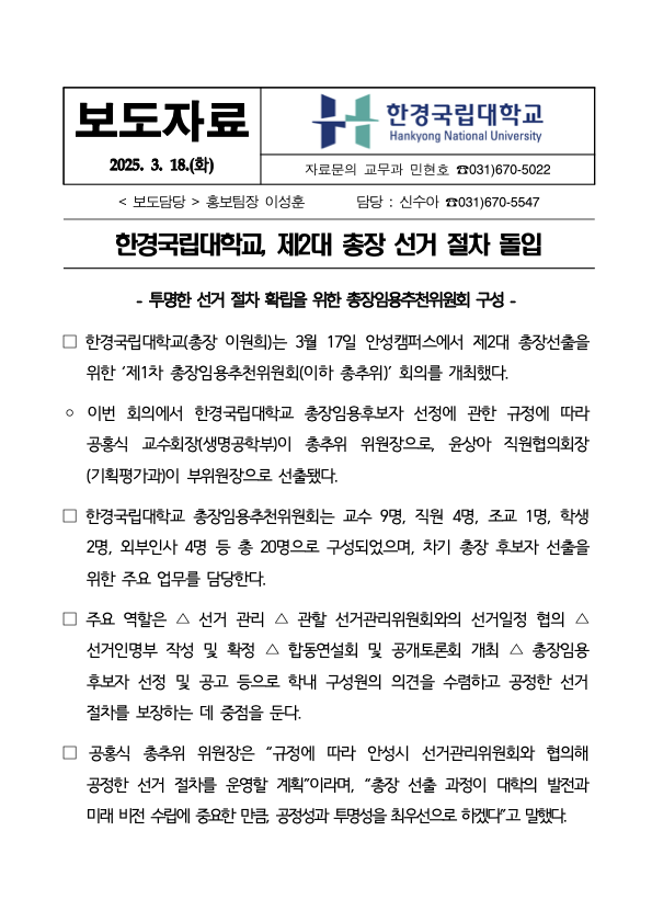 fnctId=bbs,fnctNo=570 단축 url 글번호 83550 한경국립대학교, 제2대 총장선거 절차 돌입 작성일 2025.03.19 수정일 2025.03.19 작성자 이윤석 조회수 3422 첨부파일 (보도자료) 제1회 총장추천위원회 회의 개최.hwp 댓글 작성 필수 입력 항목작성자 손님 댓글 내용을(를) 입력합니다.(필수 입력 항목)