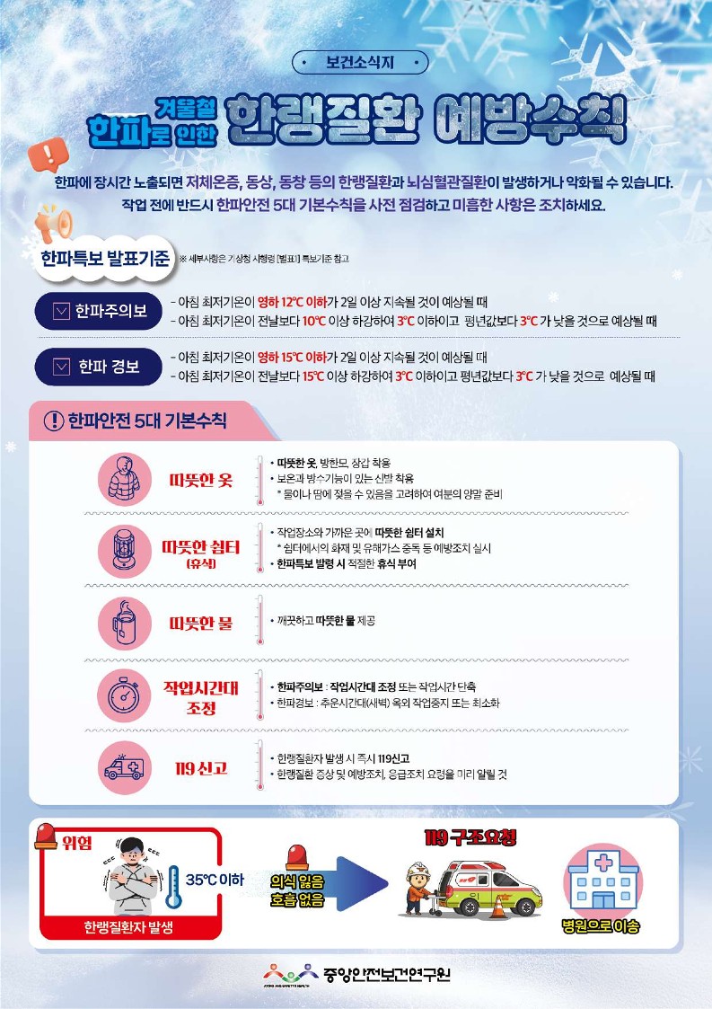 fnctId=bbs,fnctNo=350 단축 url 글번호 92440 2026년 1월 보건자료 한랭질환 예방수칙 작성일 2026.01.29 수정일 2026.01.29 작성자 산학협력단 조회수 342 첨부파일 첨부파일이(가) 없습니다.